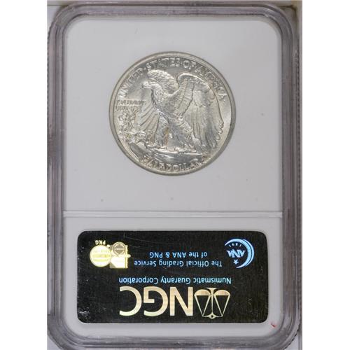 <B>1916-S<50C> MS63 NGC.</B></I> This satiny, well produced key-date piece appears quite high-end for the assigned grade. The strike is bold, with a full split thumb and good details on Liberty's head. There are few visible distractions noted on the silvery surfaces with a golden cast. A bit of weakness is noted on the eagle's lower leg. The luster is softly brilliant, and the overall eye appeal is high.