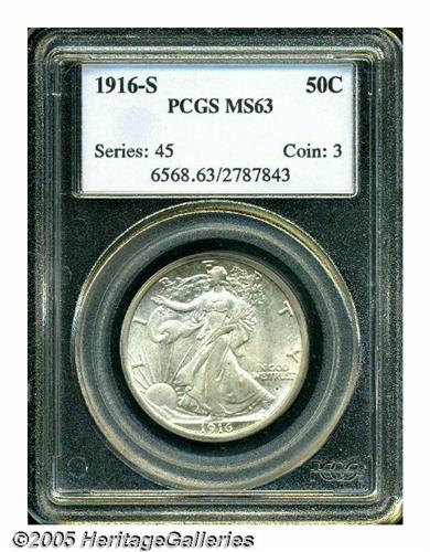 <B>1916-S<50C> MS63 PCGS.</B></I> This desirable first year key is extremely lustrous with a suggestion of golden-rose patina over both sides. Surface marks are minimal for the assigned grade.