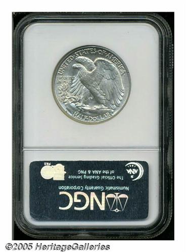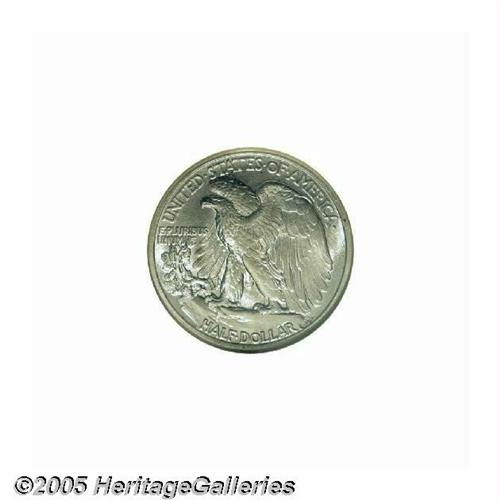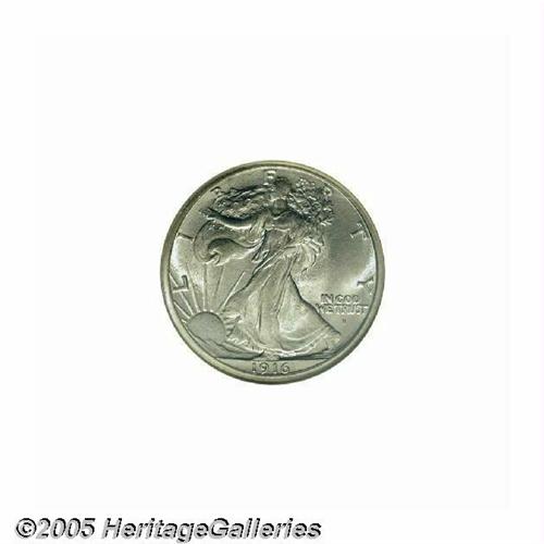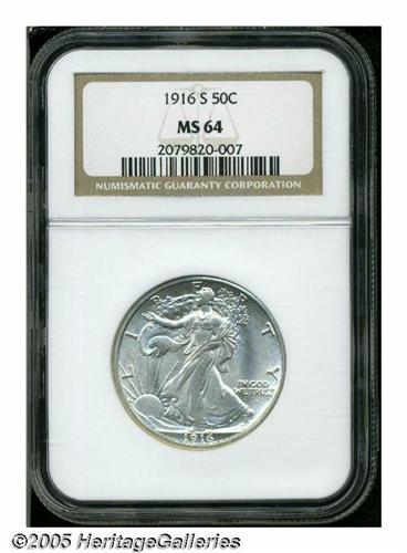 <B>1916-S<50C> MS64 NGC.</B></I> A low mintage issue with just over a half million pieces struck and remarkably few examples preserved for this first-year issue. This is a sharply struck coin that is brilliant throughout. The surfaces display the usually-seen fine granularity common to early Walkers, and the mint luster is nicely frosted. Population: 123 in 64, 59 finer (6/05).