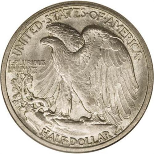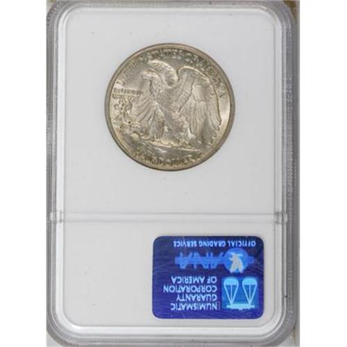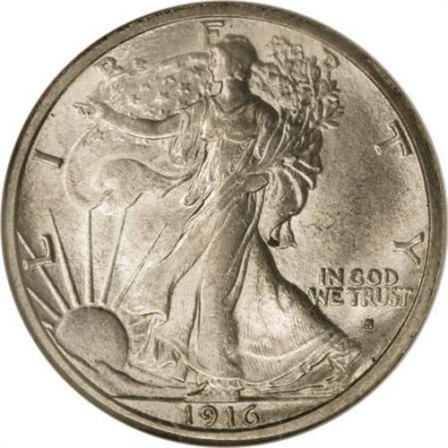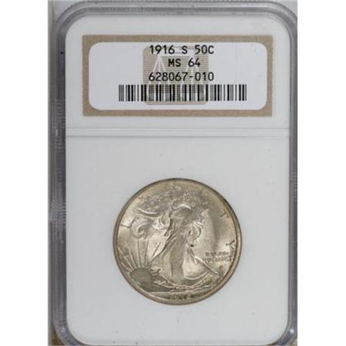 <B>1916-S 50C MS64 NGC.</B></I> An attractive survivor from a first-year issue of only 508,000 pieces, this Choice example has elements of sky-blue and tan toning over the otherwise silver-gray surfaces. The luster is uncommonly strong, though the central detail is typical, with only minor definition on Liberty's branch hand. Overall, a pleasing representative. <BR><BR><B>Coin Engraver:</B> Adolph A. Weinman<BR><BR><b>Shipping:</b> Coins & Currency (<a target="_blank" href="http://www.heritageauctions.com/common/shipping.php">view shipping information</a>)