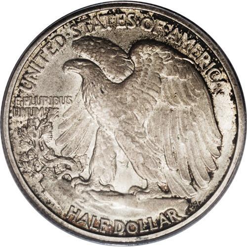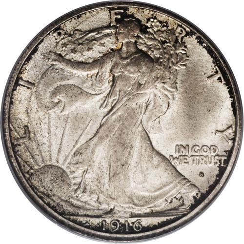 <B>1916-S<50C> MS64 PCGS.</B></I> A light silver-gray overlay, with deeper smoke-gray at the peripheries on both sides, serves to somewhat subdue the luster on this otherwise attractive piece. The strike through the centers is typical, with weakness noted on Liberty's left hand. An attractive near-Gem example of this key date.