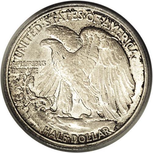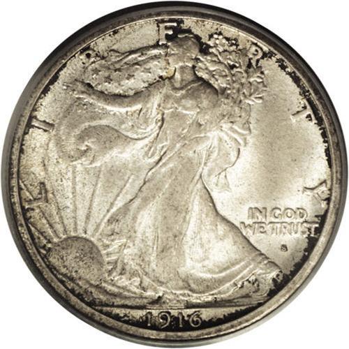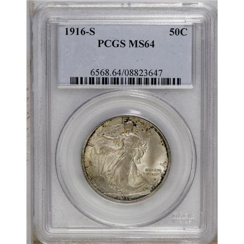 <B>1916-S<50C> MS64 PCGS.</B></I> Deep smoke-gray and russet toning covers the rims, while the centers are gray-gold on this near-Gem example. The skirt lines are weak, but the thumb, head, and eagle's legs show a pleasing amount of detail. The Obverse Mintmark 1916 and 1917 issues are really a subtype within the series, although they are also collected as part of a complete set. Elusive in Gem condition: PCGS has graded 87 pieces finer (9/06).
