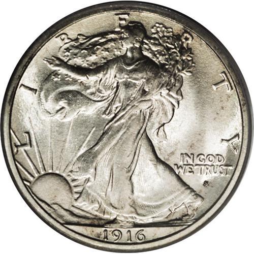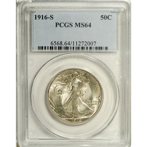 <B>1916-S 50C MS64 PCGS.</B></I> The mintage of the first-year 1916-S is just 508,000 pieces, the lowest of the series aside from the key 1921, 1921-D, and 1938-D issues. This crisply struck Gem features vivacious luster, and the light tan-gold patina only adds to the eye appeal. A tiny reverse spot at 5:30 is barely worthy of comment.<BR><BR><b>Shipping:</b> Coins & Currency (<a target="_blank" href="http://www.heritageauctions.com/common/shipping.php">view shipping information</a>)