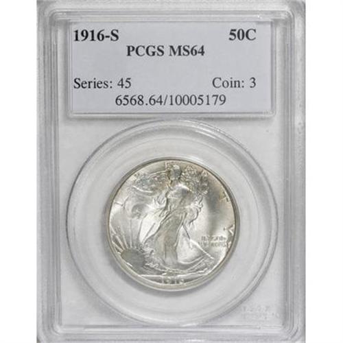 <B>1916-S 50C MS64 PCGS.</B></I> The surfaces exhibit intense satiny luster and are untoned except for a few faint whispers of color on the obverse. A few tiny nicks on the obverse are only noticeable with the aid of magnification; the reverse seems blemish-free. A semi-key first year date, and easily the scarcest of the three 1916 Walking Liberty issues. <BR><I>From The Vanek Collection.</B></I><BR><BR><b>Shipping:</b> Coins & Currency (<a target="_blank" href="http://www.heritageauctions.com/common/shipping.php">view shipping information</a>)