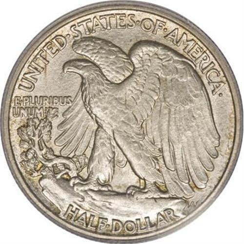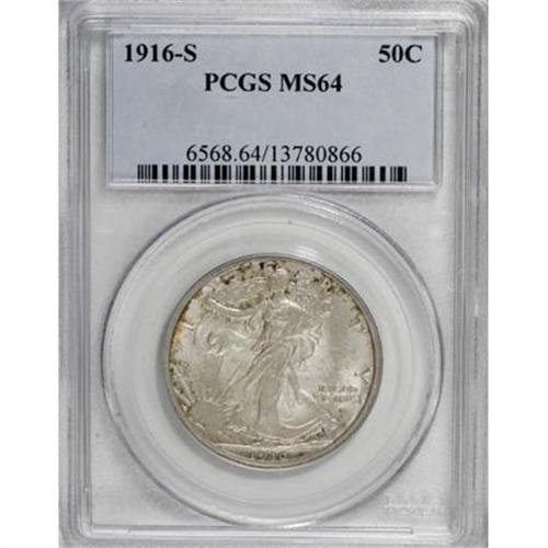 <B>1916-S 50C MS64 PCGS.</B></I> Bright silver surfaces have soft, frosty luster and splashes of peripheral gold and iridescent toning along the borders. Although this date is not particularly rare, despite a mintage of just 508,000 coins, demand is high and examples are difficult to locate.<BR><BR><B>Coin Engraver:</B> Adolph A. Weinman<BR><BR><b>Shipping:</b> Coins & Currency (<a target="_blank" href="http://www.heritageauctions.com/common/shipping.php">view shipping information</a>)