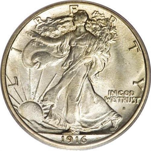 <B>1916-S 50C MS64 PCGS.</B></I> The surfaces exhibit intense satiny luster and are untoned except for a few faint whispers of color on the obverse. A few tiny nicks on the obverse are only noticeable with the aid of magnification; the reverse seems blemish-free. A semi-key first year date, and easily the scarcest of the three 1916 Walking Liberty issues. <BR><BR><B>Coin Engraver:</B> Adolph A. Weinman<BR><BR><b>Shipping:</b> Coins & Currency (<a target="_blank" href="http://www.heritageauctions.com/common/shipping.php">view shipping information</a>)