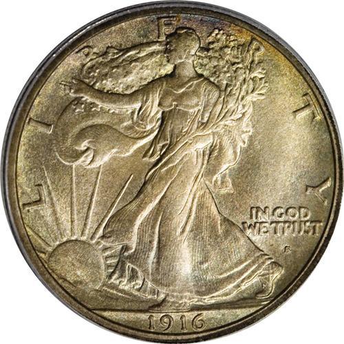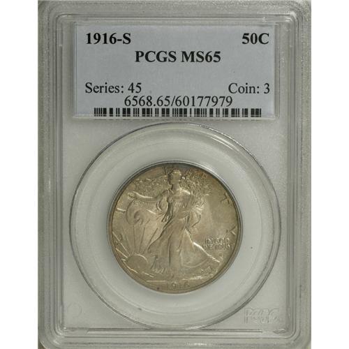 <B>1916-S 50C MS65 PCGS.</B></I> Fully lustrous with medium antique-golden toning over each side. The matte-like, satiny surfaces are nearly void of post-striking impairments, just a couple of microscopic marks are seen under close examination. The strike, while not 100% full, is exceptional for this scarce issue. The combination of first-year of issue and obverse mintmark make this date one of the most popular twentieth century coins. Population: 75 in 65, 14 finer (1/07).<BR><BR><b>Shipping:</b> Coins & Currency (<a target="_blank" href="http://www.heritageauctions.com/common/shipping.php">view shipping information</a>)