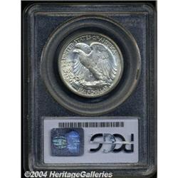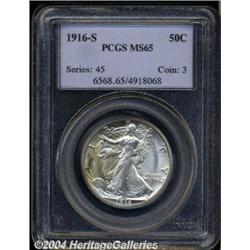 <B>1916-S<50C> MS65 PCGS.</B></I> The '16-S is by a wide margin the scarcest of the three 1916 Walking Liberty issues in any grade. It is also a challenging strike rarity. This piece is well defined on Liberty's hand and head area, being just a trifle soft on her skirt lines, an area that is characteristically weak on early issues. The surfaces are mostly brilliant, save for an area of spotty golden-brown toning at the left side of the obverse, and show the usually seen fine-grain, matte-like texture. Population: 71 in 65, 12 finer (7/04).<BR><I>From The Dr. Frank Lanza Collection of Walking Liberty Half Dollars.</B></I> <BR><BR><B>Important notice:</B> Heritage usually auctions material at the rate of 200-250 lots per hour. On some occasions eBay Live bid software or the Internet may not be able to keep up with the pace of the auction. We recommend placing a realistic absentee bid now as insurance to avoid disappointment. Occasionally the auctioneer may eliminate or reject an eBay Live bid, and the auctioneer may also reopen a lot after the close of the eBay live bidding (usually because we missed an audience bid), and may reject your bid even if it shows you as the winning bidder. By bidding via eBay Live, you agree that Heritage may award the lot to another bidder at its sole discretion under the circumstances described above or any other reasonable circumstances. Since eBay bids are not shown to us until we open the lot on the floor, we treat those bids just like floor bids. In most cases the floor responds before the eBay bid is presented to us, due to Internet lag time, so for consistency we have made it a policy that floor bids are always considered first over tie eBay live bids. Also please note that all Heritage lots purchased through eBay Live carry a 20% Buyer's Premium. Please make sure you read the Terms and Conditions before you bid. </span></font></tr></table></td></tr></table>
