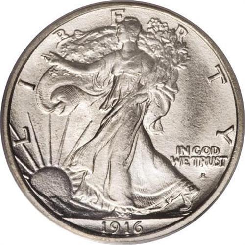 <B>1916-S 50C MS65 PCGS.</B></I> The centers exhibit a whisper of gold toning, but most collectors would agree that the present lustrous Gem is brilliant. Even the aid of a loupe reveals only minimal contact, and the strike is sharp on the branch hand and other areas. The lowest mintage San Francisco issue of the type.<BR><BR><B>Coin Engraver:</B> Adolph A. Weinman<BR><BR><b>Shipping:</b> Coins & Currency (<a target="_blank" href="http://www.heritageauctions.com/common/shipping.php">view shipping information</a>)