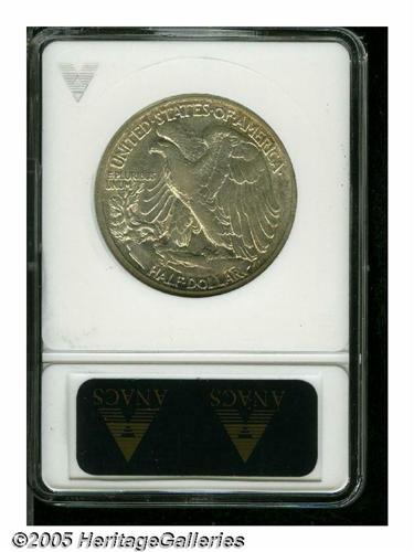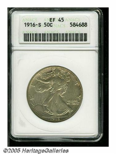 <B>1916-S<50C> XF45 ANACS.</B></I> Bright surfaces display whispers of golden-brown patina in localized areas, and are remarkably clean. Most of the design elements display nice definition. With a mintage of 508,000 pieces, the 1916-S is by far the scarcest of the first-year Walking Liberty issues at all grade levels.<BR><I>From The Stig Ericsson Collection.</B></I>