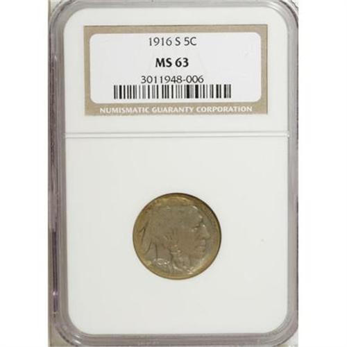 <B>1916-S 5C MS63 NGC.</B></I> NGC Census: (133/233). PCGS Population (224/358). Mintage: 11,860,000. Numismedia Wsl. Price for NGC/PCGS coin in MS63: $224. (#3933)<BR><BR><B>Coin Engraver:</B> James E. Fraser<BR><BR><b>Shipping:</b> Coins & Currency (<a target="_blank" href="http://www.heritageauctions.com/common/shipping.php">view shipping information</a>\)