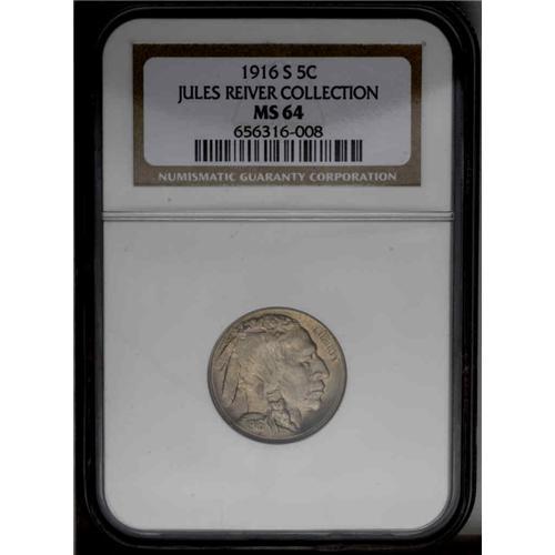 <B>1916-S<5C> MS64 NGC.</B></I> A very well struck example of this semi-key date in the Buffalo nickel series. Rich luster is present under a layer of lovely olive and amber-gold toning. Nearly blemish-free and carbon-free on both sides.