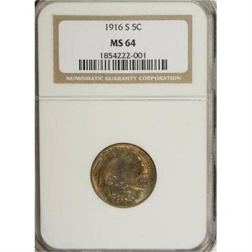 <B>1916-S 5C MS64 NGC.</B></I> NGC Census: (187/44). PCGS Population (250/104). Mintage: 11,860,000. Numismedia Wsl. Price for NGC/PCGS coin in MS64: $432. (#3933)<BR><BR><b>Shipping:</b> Coins & Currency (<a target="_blank" href="http://www.heritageauctions.com/common/shipping.php">view shipping information</a>)
