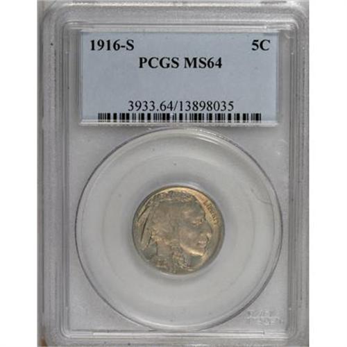 <B>1916-S 5C MS64 PCGS.</B></I> PCGS Population (256/106). NGC Census: (190/44). Mintage: 11,860,000. Numismedia Wsl. Price for NGC/PCGS coin in MS64: $432. (#3933)<BR><BR><B>Coin Engraver:</B> James E. Fraser<BR><BR><b>Shipping:</b> Coins & Currency (<a target="_blank" href="http://www.heritageauctions.com/common/shipping.php">view shipping information</a>)