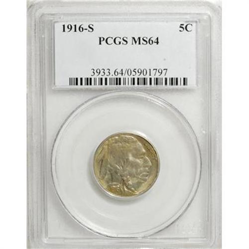<B>1916-S 5C MS64 PCGS.</B></I> PCGS Population (262/107). NGC Census: (191/45). Mintage: 11,860,000. Numismedia Wsl. Price for NGC/PCGS coin in MS64: $432. (#3933)<BR><BR><B>Coin Engraver:</B> James E. Fraser<BR><BR><b>Shipping:</b> Coins & Currency (<a target="_blank" href="http://www.heritageauctions.com/common/shipping.php">view shipping information</a>)