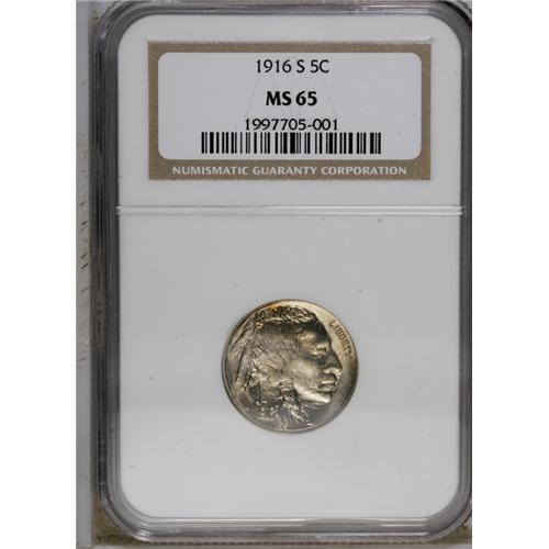 <B>1916-S<5C> MS65 NGC.</B></I> A highly lustrous Gem, nicely defined for this issue. Reddish-gold patina covers parts of each side, and clash marks are visible on either side of the Indian's neck. Census: 30 in 65, 11 finer (8/06).