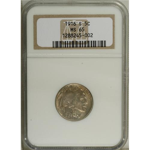 <B>1916-S 5C MS65 NGC.</B></I> A pleasing Gem that has strong detail and soft, attractive luster. Hardly any marks are present in the olive-gold fields. Census: 31 in 65, 11 finer (11/06).<BR><BR><b>Shipping:</b> Coin/Currency (<a target="_blank" href="http://www.heritageauctions.com/common/shipping.php">view shipping information</a>)