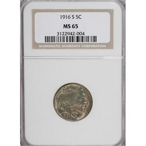 <B>1916-S 5C MS65 NGC.</B></I> Warm tan and green-gold toning graces the subtly lustrous surfaces of this S-mint Gem. The overall detail is above-average, and the eye appeal is impressive. NGC has certified 14 numerically finer pieces (1/08).<BR><BR><B>Coin Engraver:</B> James E. Fraser<BR><BR><b>Shipping:</b> Coins & Currency (<a target="_blank" href="http://www.heritageauctions.com/common/shipping.php">view shipping information</a>)
