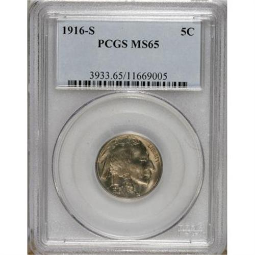 <B>1916-S 5C MS65 PCGS.</B></I> This lustrous walnut-brown and steel-gray Gem is pleasantly unperturbed by contact. The centers show minor incompleteness, but the date, mintmark, tail, horn, and LIBERTY are well struck. Population: 74 in 65, 30 finer (4/07).<BR><BR><b>Shipping:</b> Coins & Currency (<a target="_blank" href="http://www.heritageauctions.com/common/shipping.php">view shipping information</a>)