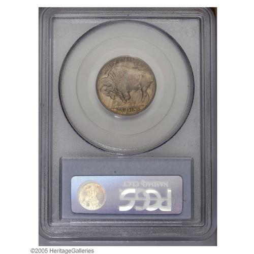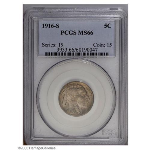 <B>1916-S<5C> MS66 PCGS.</B></I> The grade distribution of surviving 1916-S Nickels is quite fascinating. While VF and XF representatives are relatively common, those at the bookends of the grading scale are scarce, if not rare. Gems definitely fall into the latter (rare) category with PCGS and NGC reporting just 31 examples in MS66. There are just five coins finer (10/05). This particular example may not be fully struck, but the overall definition is well above average in all areas with no areas of bothersome lack of detail. Medium intensity champagne-gray patina envelops virtually pristine surfaces that are equally free of distracting bagmarks and carbon.