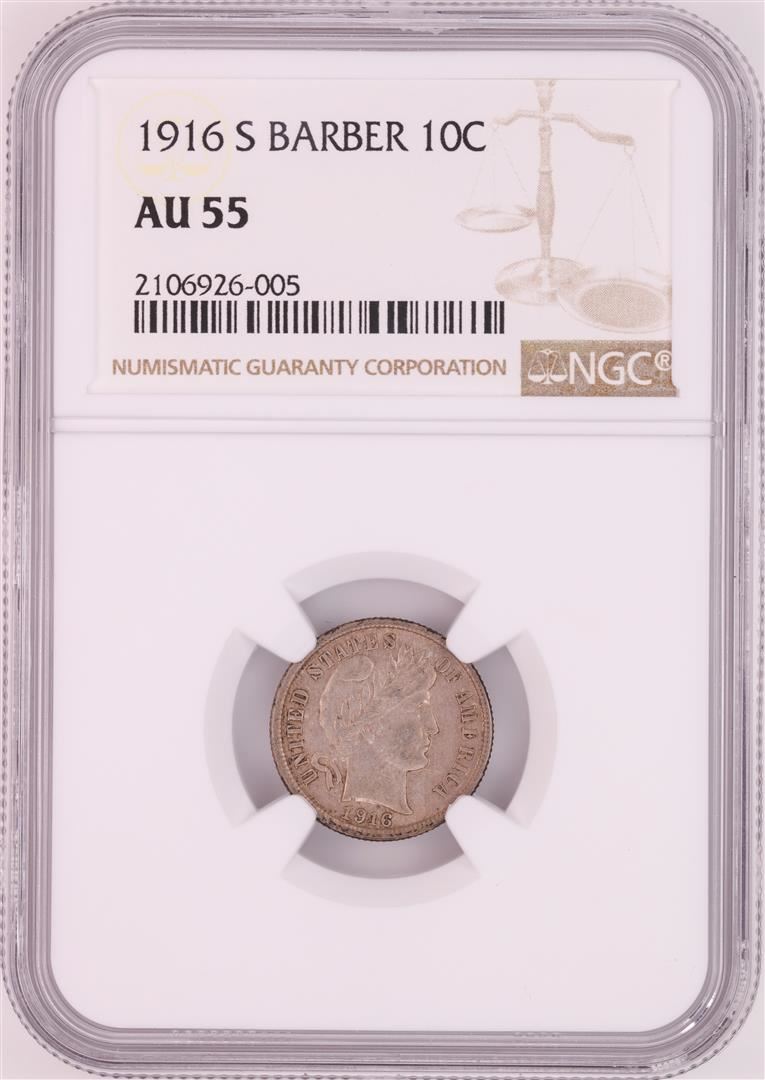 One 1916-S Barber Dime Coin NGC AU55. NGC Certified.