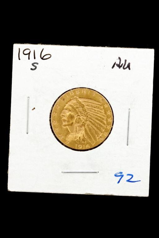 1916-S Five Dollar Indian Gold Piece About A.U. to UNC; not professionally graded.About A.U. to UNC; not professionally graded.