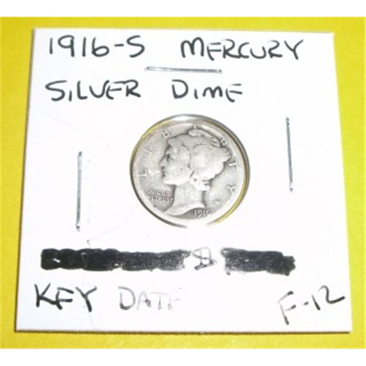 1916-S Mercury Silver Dime *RARE KEY DATE F-12 GRADE*!! ***Coin & Currency Grades, Conditions & Values are not Safe Deposit Coins Responsibilty. Grades, Conditions & Values are determined by Consigner(s) & Buyers***