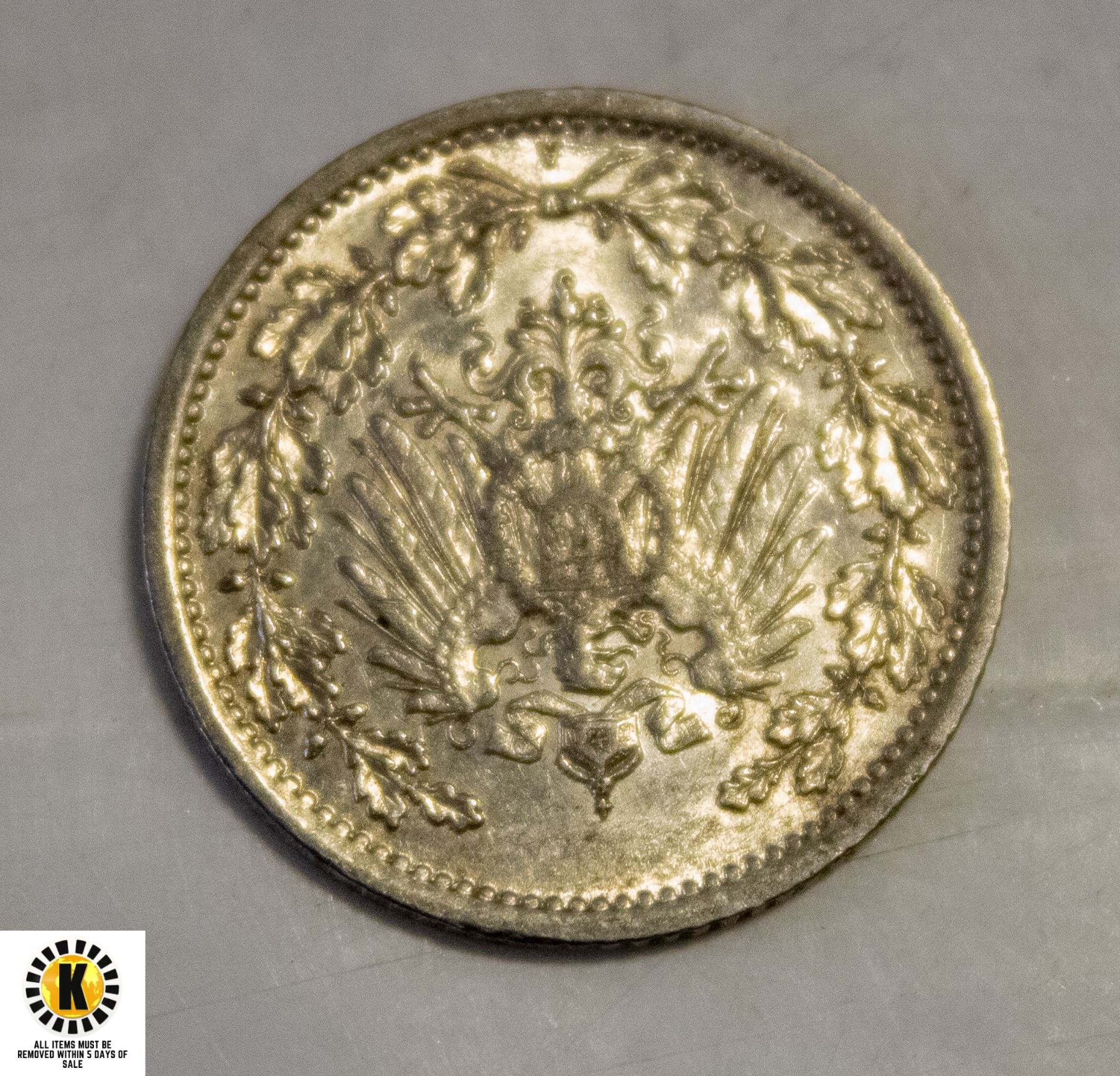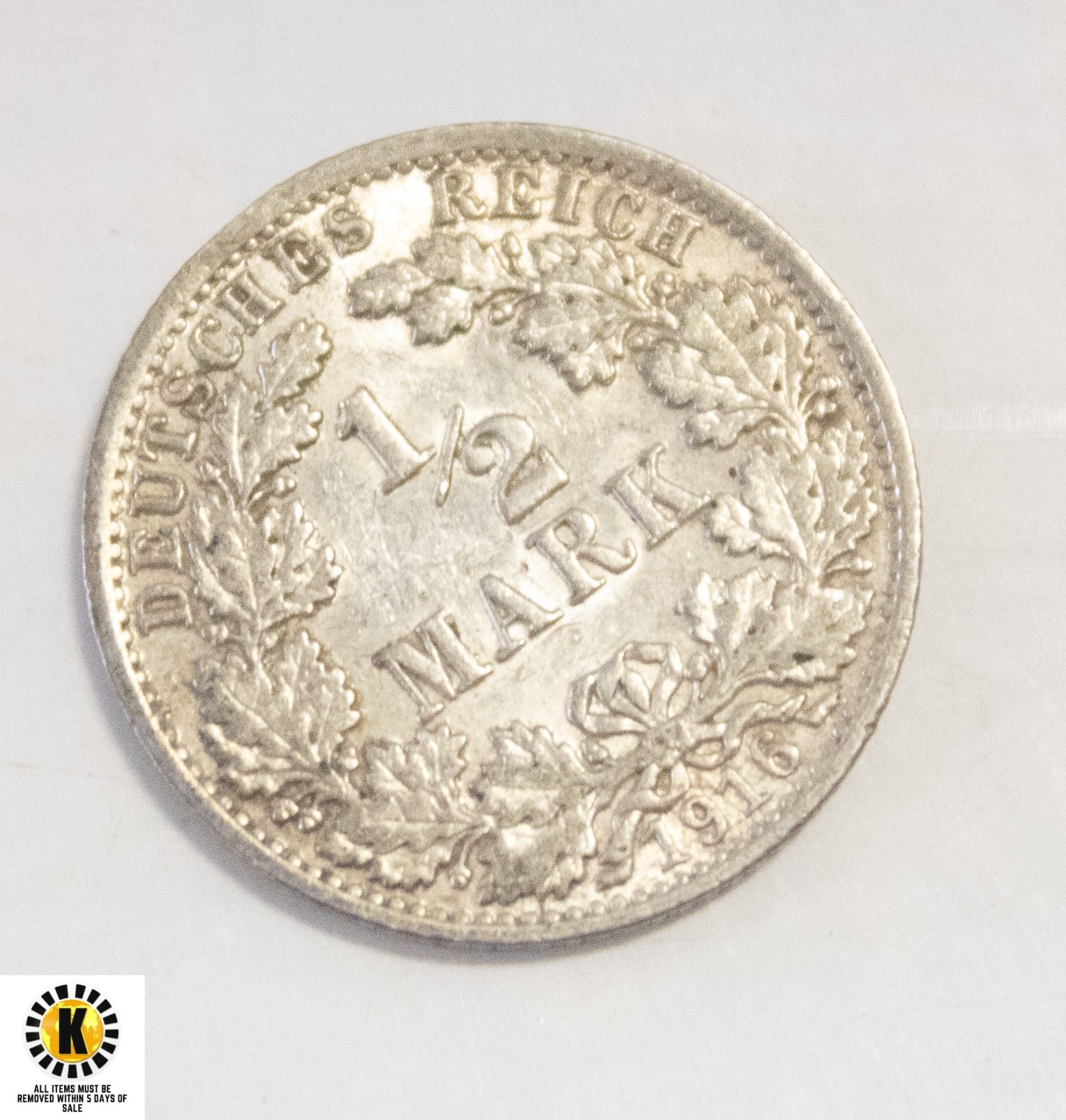 1916 SILVER PRUSSIA 1/2 MARK COIN, EXTRA FINE