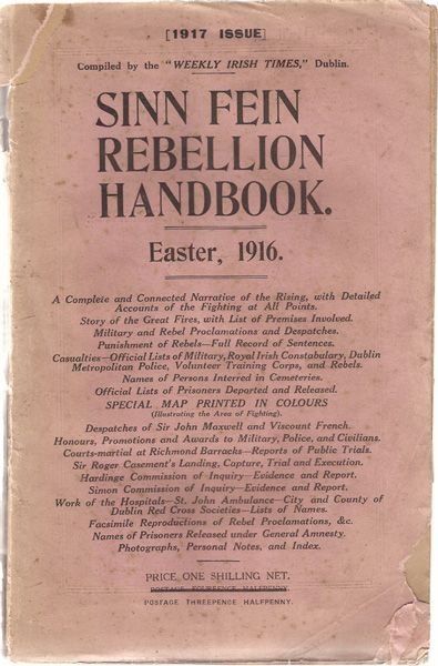 1917 edition of this extremely useful reference on the 1916 Rising. Including casualty lists and lists of rebel prisoners. Complete with printed map illustrating the areas of fighting in Dublin. Published by the Weekly Irish Times