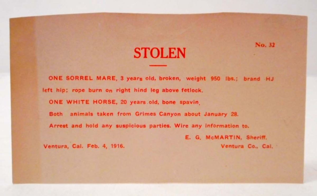 1916 VENTURA, CALIFORNIA STOLEN MARE NOTICE POSTCARD