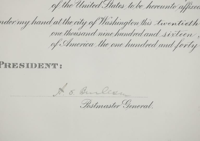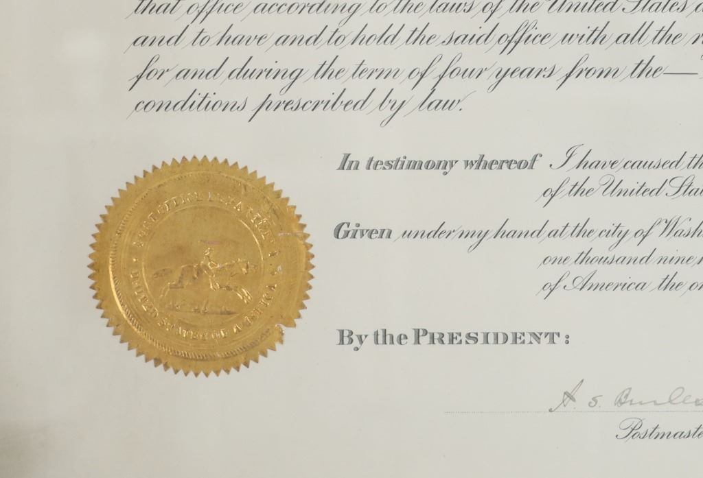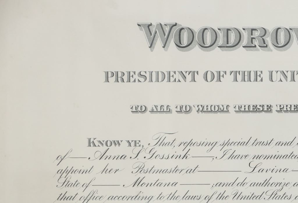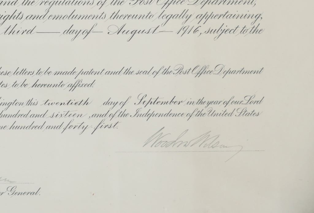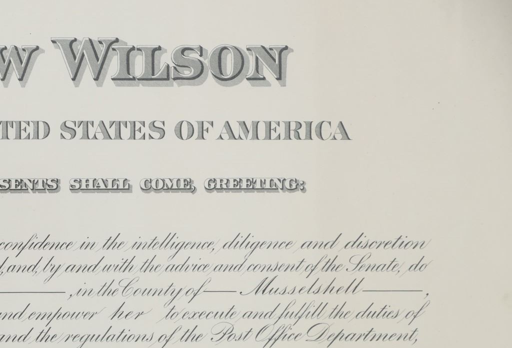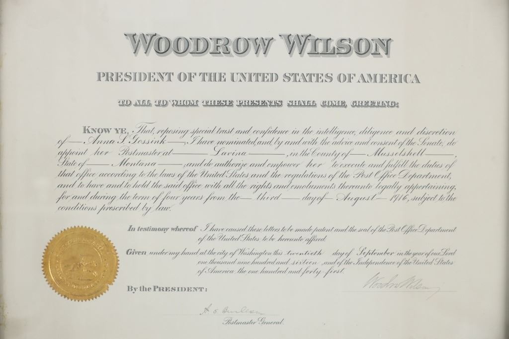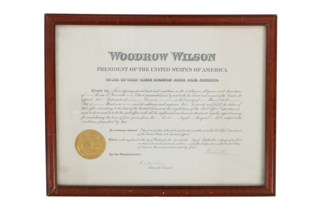 Featured in this lot is this 1916 Woodrow Wilson Presidential Postmaster appointment certificate. The document features a wonderfully and professionally crafted construction that is documentation of a Postmaster appointment in 1916 for Lavina in the county of Musselshell in Montana. The condition of this certificate is good with no obvious signs of damage to the document and shows slight wear to the wooden frame but otherwise shows a good overall condition. The measurements of this certificate is 15 5/8" x 19 3/4" and the visible certificate measures 13 3/4" x 17 7/8". The collective weight of this framed certificate is 3lb 6oz.