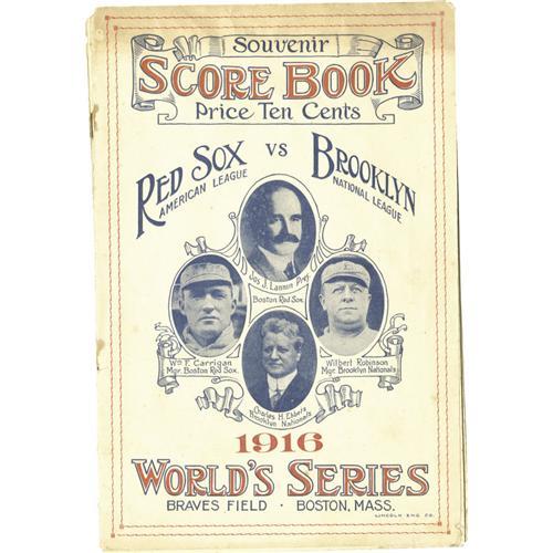<B>1916 World Series Official Program (Boston).</B></I> Just two days after a fan in Boston neatly scored the first game of the Fall Classic in this exceptionally scarce program, a young pitcher named Ruth would sample his first taste of immortality with thirteen scoreless innings of pitching in Game Two. The inaugural game saw the Sox jump out to an early lead in a Series they would eventually win in five, with the home town squad almost blowing a six to one lead in the ninth after giving up four to the "never say die" Brooklyn Robins. The action is registered in pencil on two pages adorned with images of the latest Dodge Brothers Motor Cars. Team photos, including a baby-faced Ruth, are inside as well. This Souvenir Score Book from that dramatic day at Braves Field shows expected wear from its nine decades of life, with the front and rear covers loose from the stapled binding and some minor tears and foxing to the interior pages, but one must forgive such imperfections given the tremendous rarity of the piece. Only a tiny handful could possibly exist today.