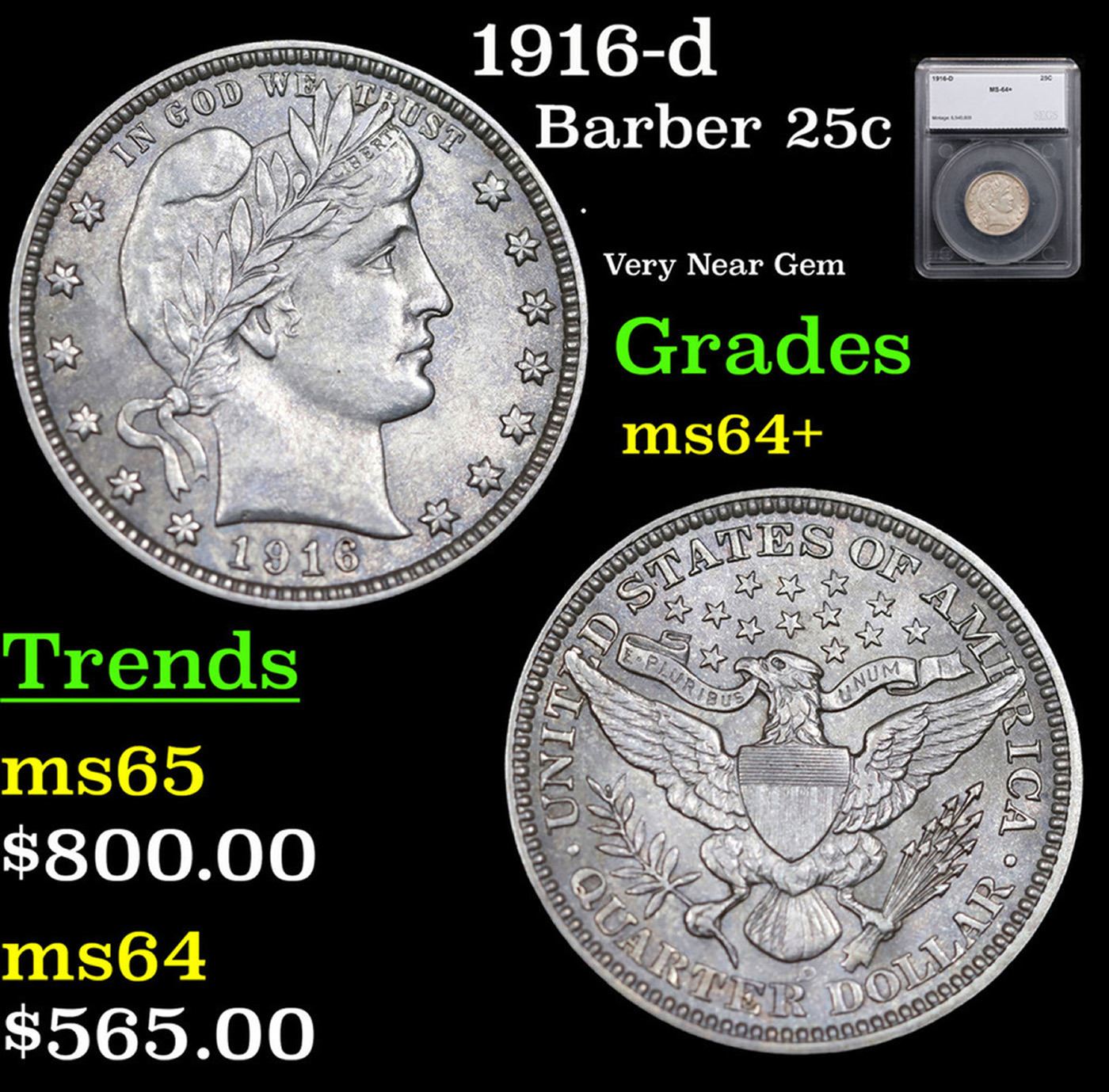 1916-d Barber Quarter 25c Graded ms64+ By SEGS. Final year of issue of the Barber series.