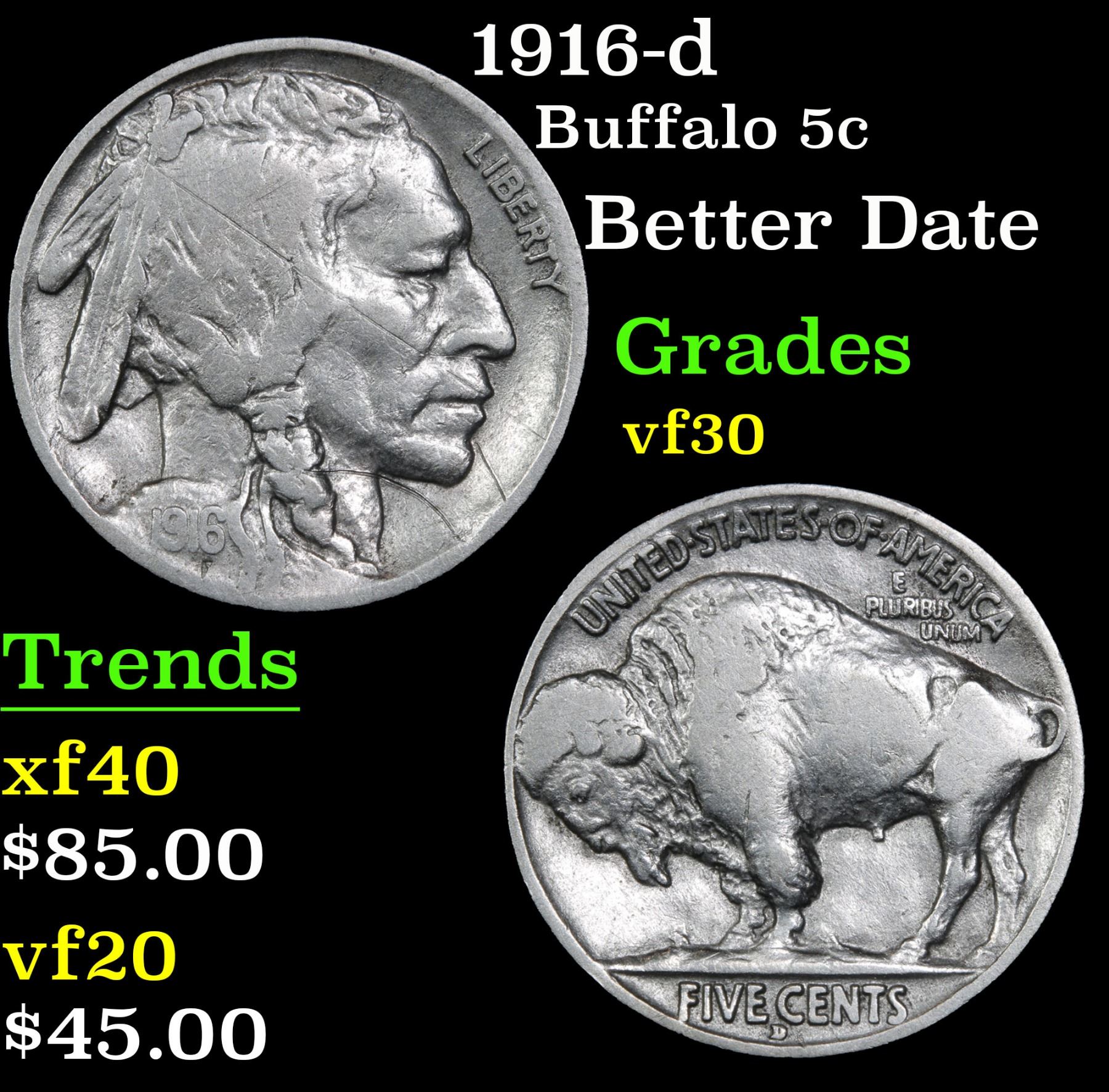 1916-d Better Date . Buffalo Nickel 5c Grades vf++. According to David Hall, ÔThe 1916-D is scarce in circulated grades and scarce in mint state. It is very scarce in Gem MS65 or better condition. In Gem condition, it is about equal in rarity to the 1913-D Type 2, 1914-D, 1915-D, and 1917-D.