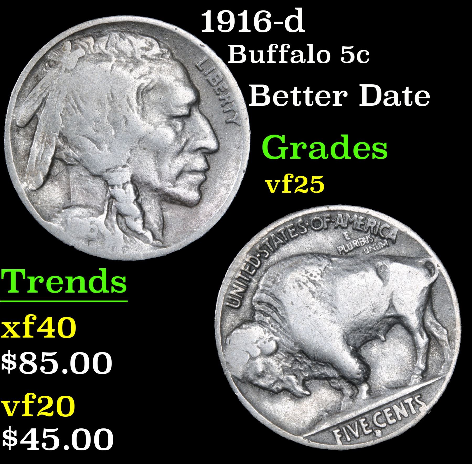 1916-d Better Date . Buffalo Nickel 5c Grades vf+. According to David Hall, ÔThe 1916-D is scarce in circulated grades and scarce in mint state. It is very scarce in Gem MS65 or better condition. In Gem condition, it is about equal in rarity to the 1913-D Type 2, 1914-D, 1915-D, and 1917-D.