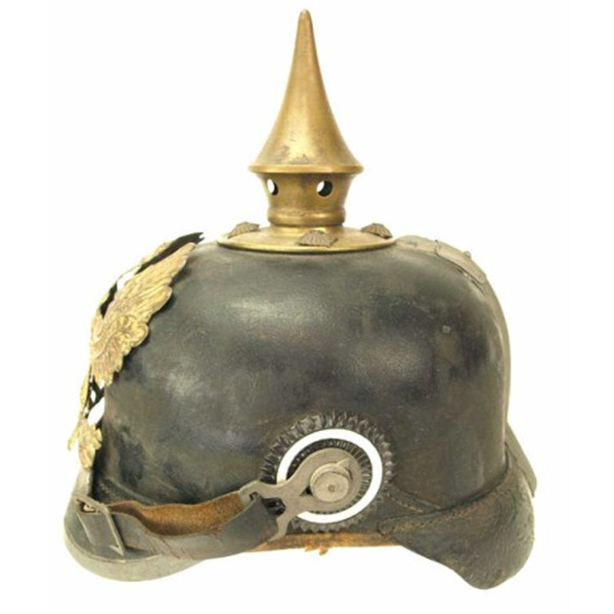 1916 date German Pickelhaube helmet with black leather body, metal ribbed rear, brass spike and Prussian plate. Named on interior and dated 1916. Helmet remains near fine condition, liner intact.