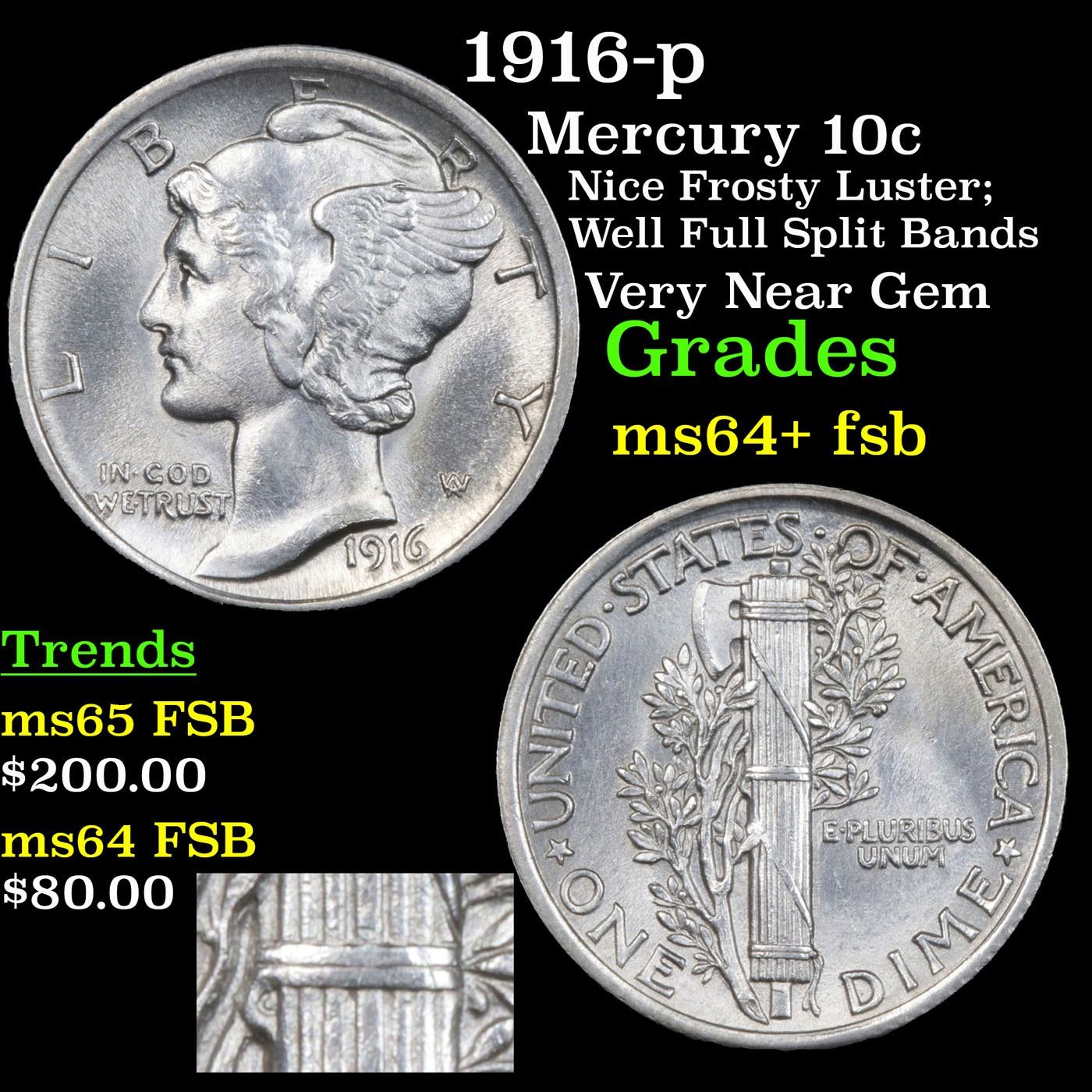 1916-p Mercury Dime 10c Grades Choice Unc+ FSB.