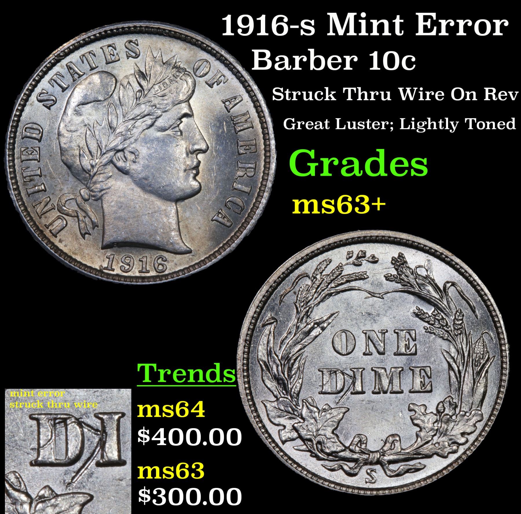 1916-s Mint Error Struck Thru Wire On Rev Great Luster; Lightly Toned Barber Dime 10c Grades Select+ Unc. Incredibly cool coin. It is a significant mint error with the reverse struck thru wire. Great luster, lightly toned, and major clashing throughout the obverse. Wild coin. A Corey's Pick