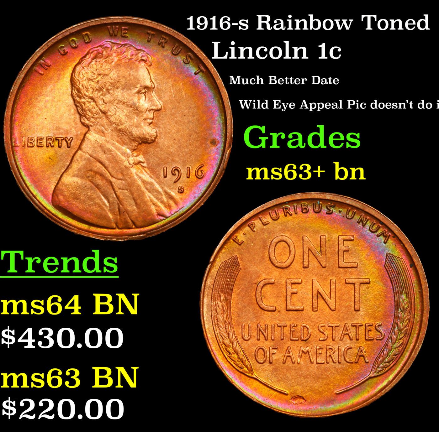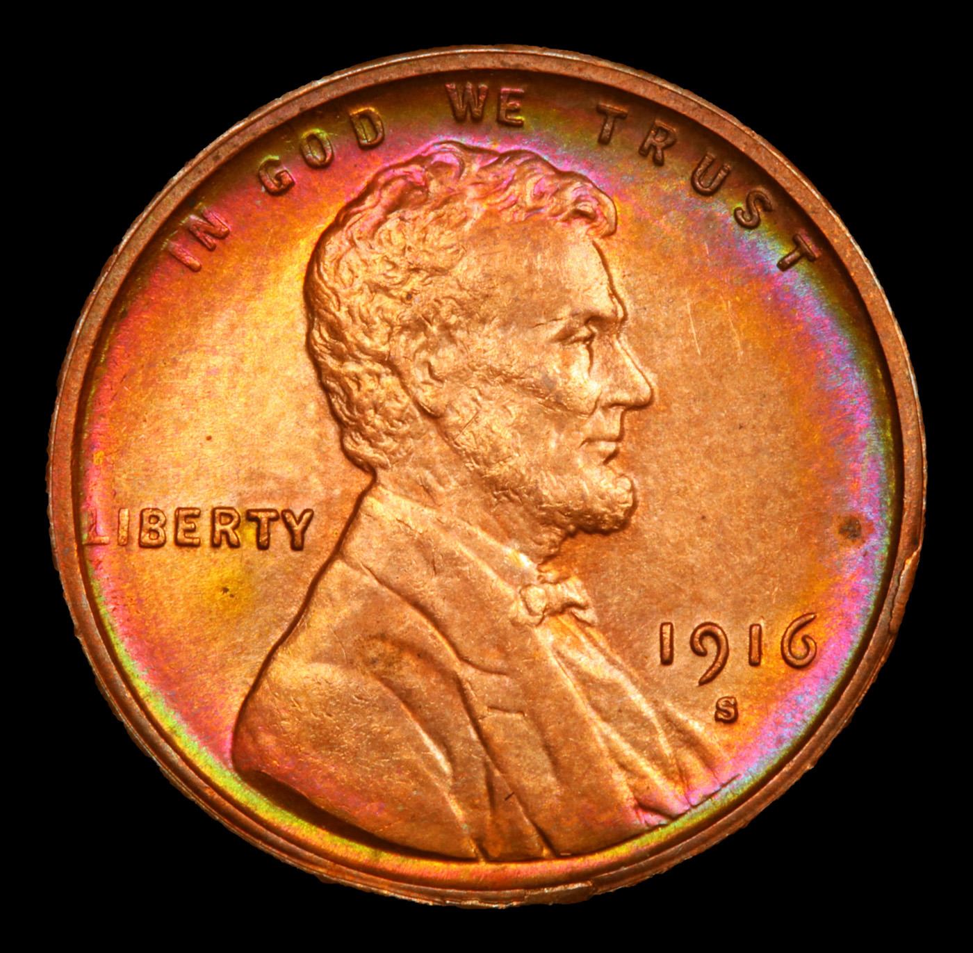 1916-s Rainbow Toned Lincoln Cent 1c Grades Select+ Unc BN.