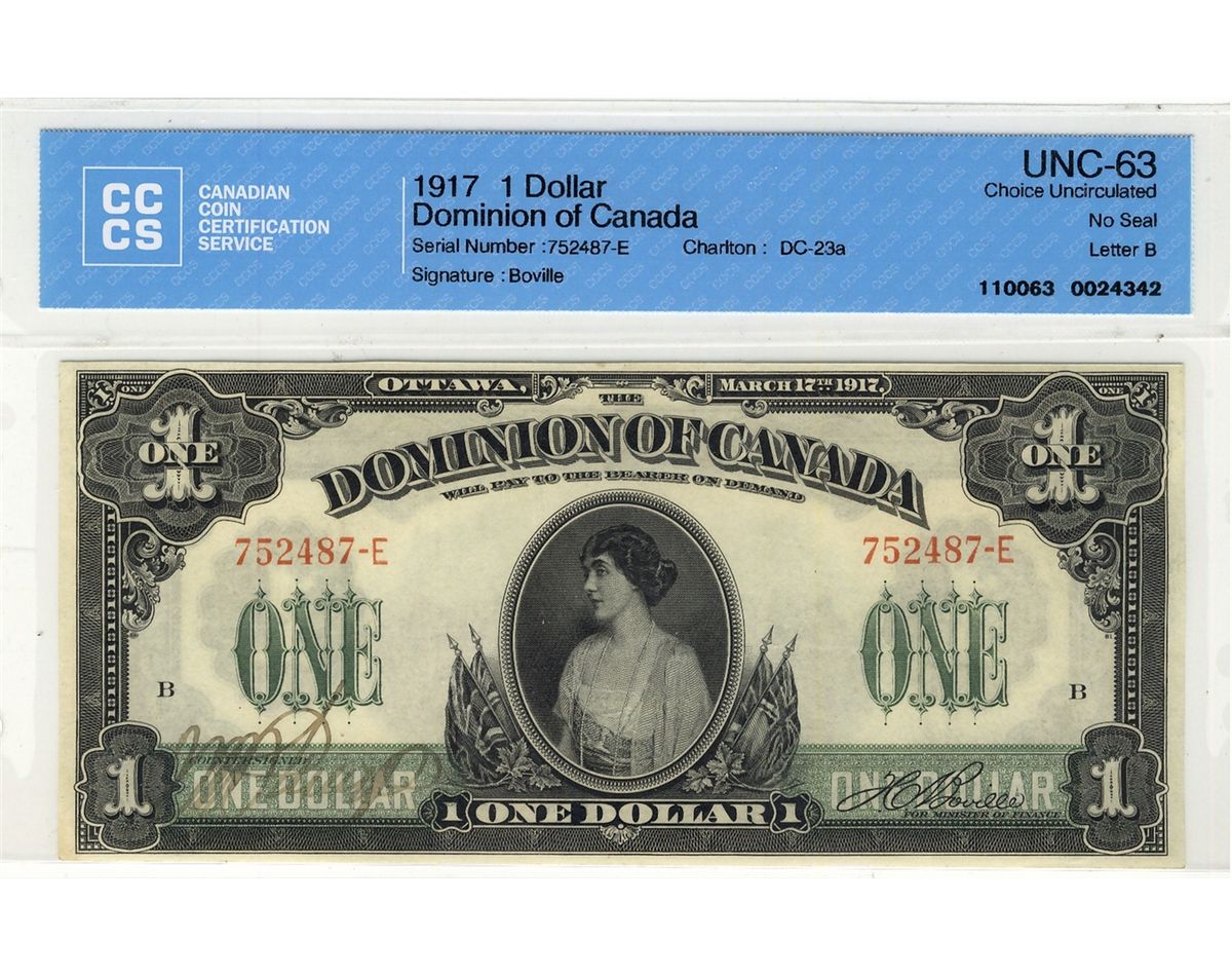 1917 $1 DC-23a #752487-E CCCS CH UNC63. Bright attractive issue with sharp corners.