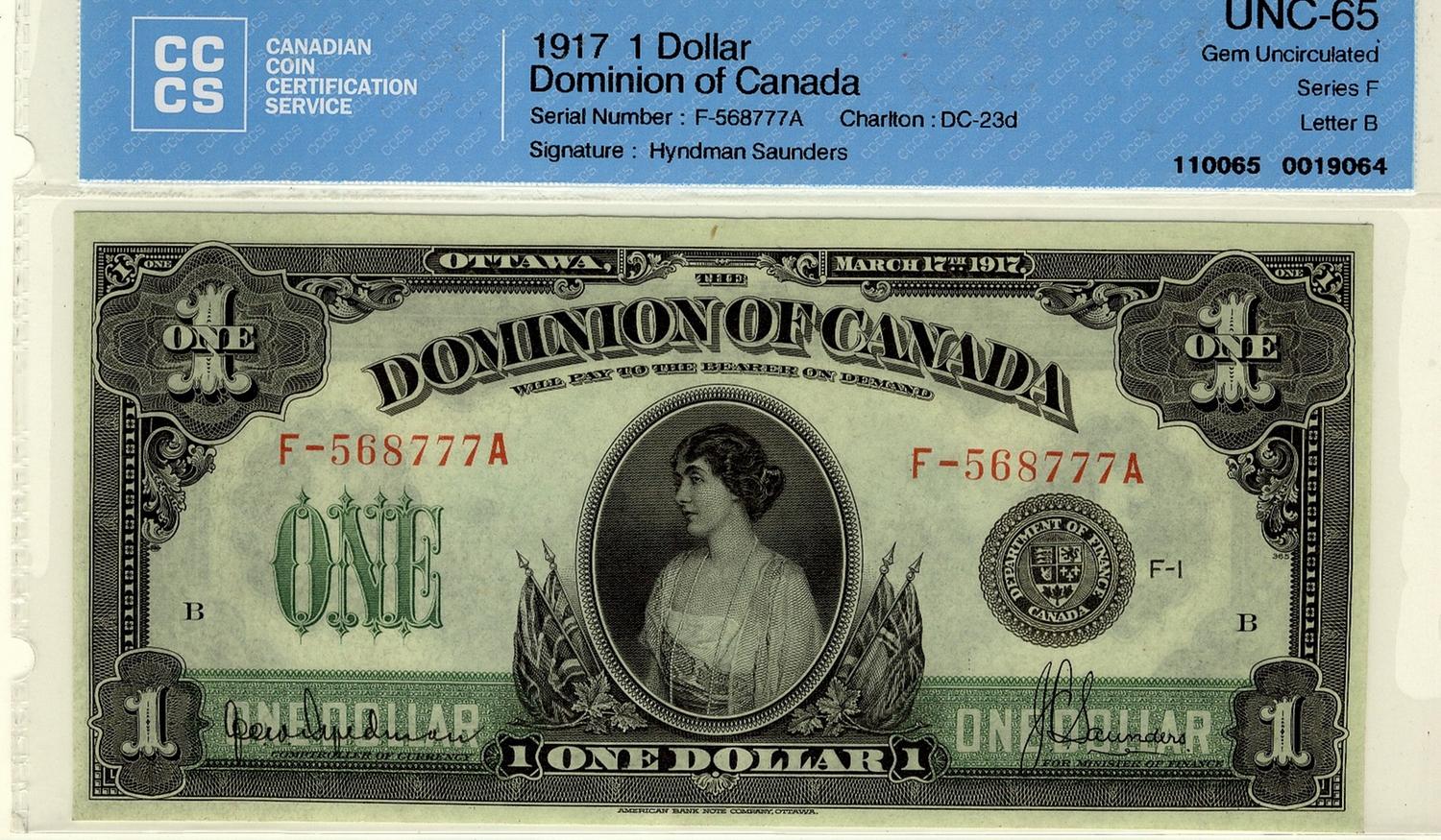 1917 $1 DC-23d #F-567777A, CCCS Gem UNC65. A bright and attractive example.