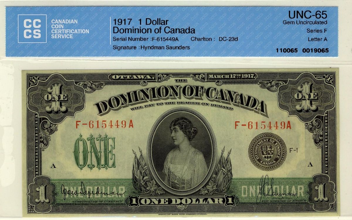 1917 $1 DC-23d /F-615449A, CCCS UNC65. A superb Gem example with vibrant colors.