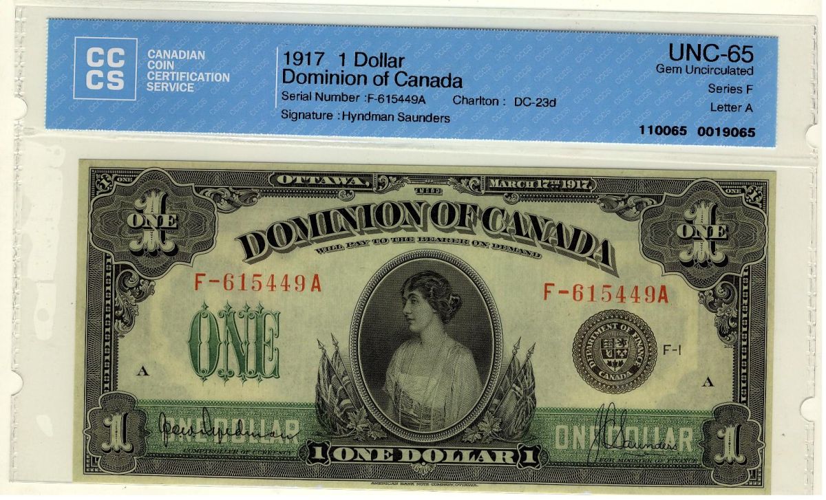 1917 $1 DC-23d /F-615449A, CCCS UNC65. A superb Gem example with vibrant colors.