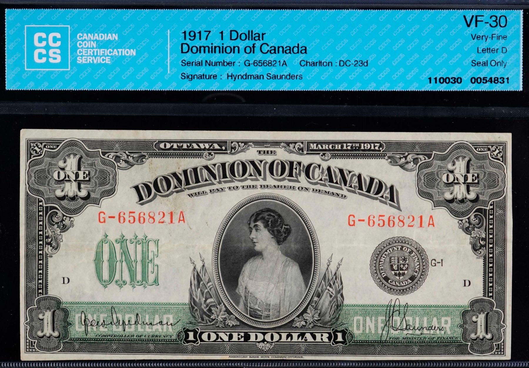 1917 $1 DC-23d #G-656821A CCCS VF30. A bright example with vibrant colours.