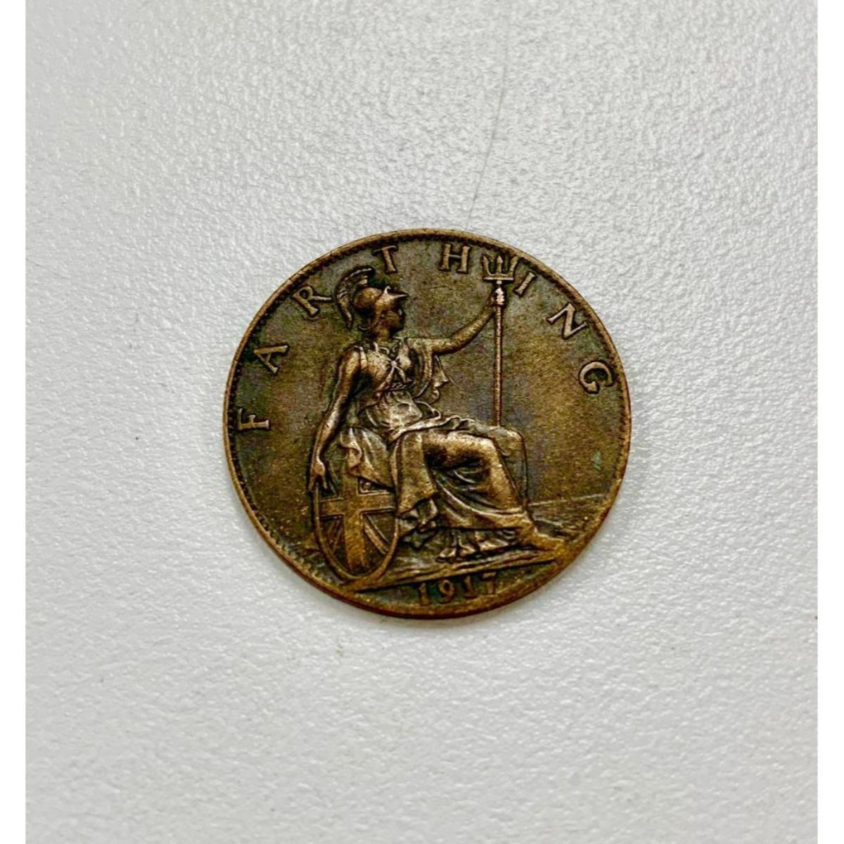 Obverse Uncrowned portrait of King George V facing left, legend around. Lettering: GEORGIUS V DEI GRA:BRITT:OMN:REX FID:DEF:IND:IMP: BM Translation: George the Fifth by the Grace of God King of all the Britons Defender of the Faith Emperor of India Engraver: Edgar Bertram MacKennal Reverse Seated figure of Britannia facing right, trident in left hand, shield with Union flag in right hand, denomination above, sea behind, date in exergue. Lettering: FARTHING 1917 Engraver: Leonard Charles Wyon Edge Plain Specifications Country: United Kingdom King; George V (1910-1936) Type; Standard circulation coin Years; 1911-1925 Value; 1/4 Penny = 1/48 Shilling (1/960) Currency; Pound sterling (1158-1970) Composition; Bronze Weight; 2.83 g Diameter; 20 mm Thickness; 1.3 mm Shape; Round