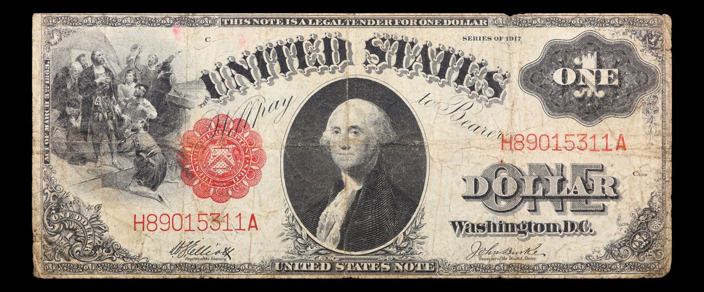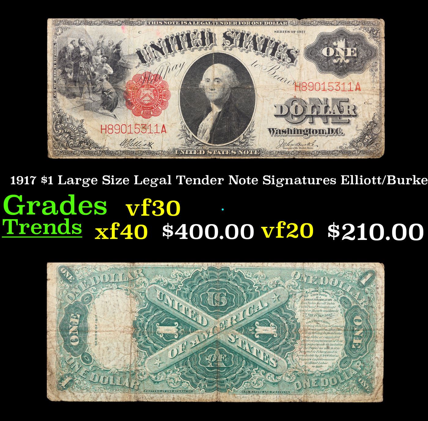 1917 $1 Large Size Legal Tender Note Grades vf++ Signatures Elliott/Burke. FR-37 This 1917 $1 note is the last large-sized legal tender bank note ever issued. It's referred to as a "Horseblanket Note," due to their large size. The obverse features Washington and a vignette of Columbus sighting America. The reverse shows a "sawhorse" design. Add in the bright red seal and serial numbers and you've got a miniature work of art.