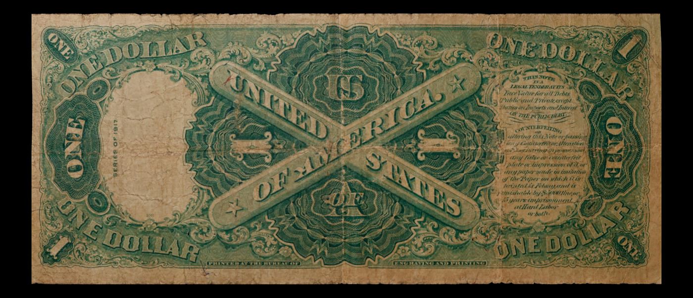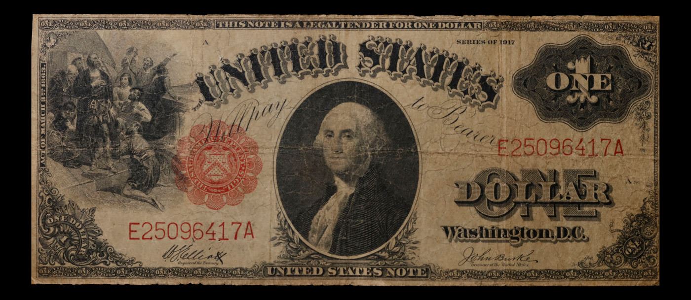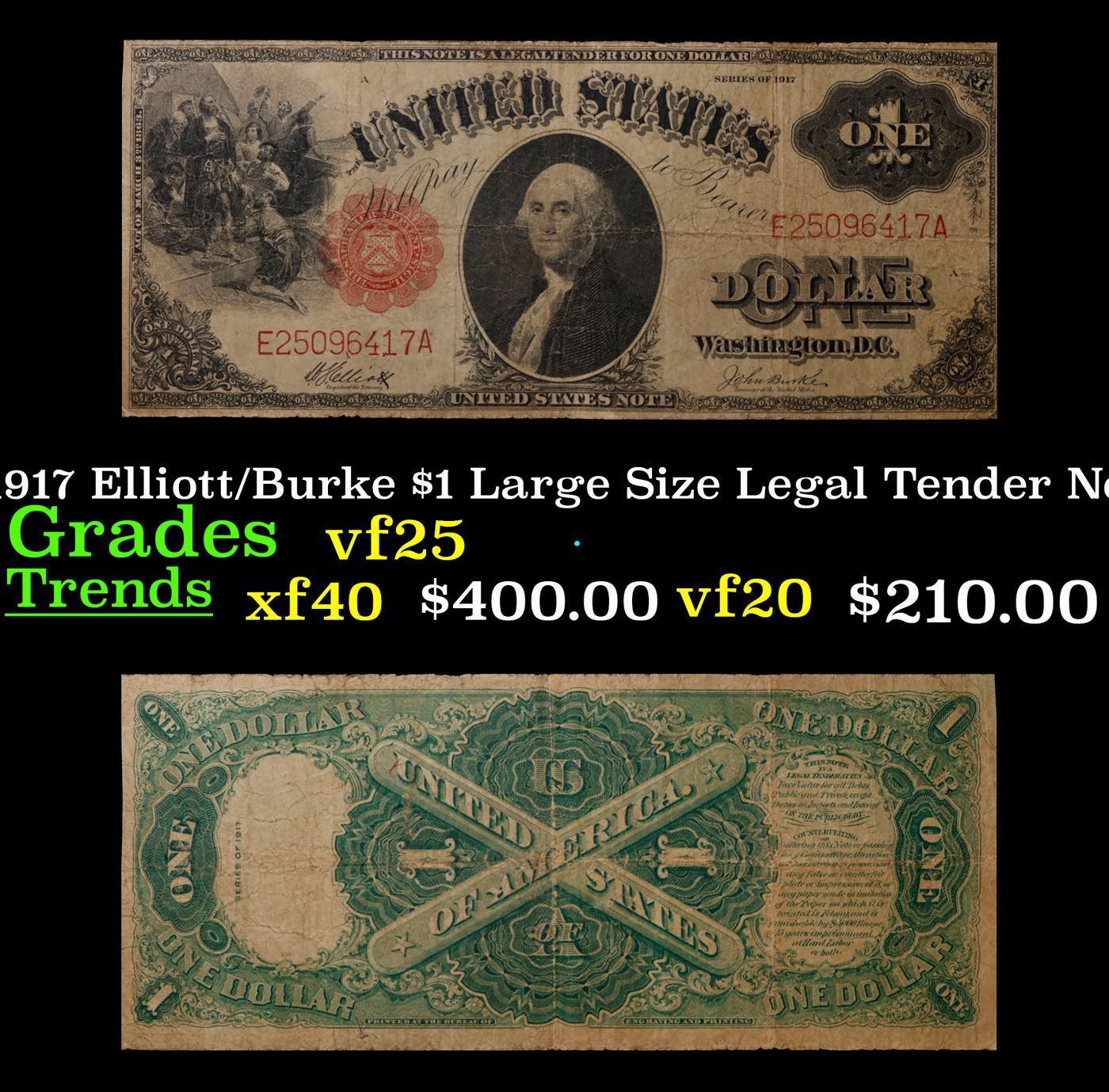 1917 $1 Large Size Legal Tender Note Grades vf+ Signatures Elliott/Burke. FR-37 This 1917 $1 note is the last large-sized legal tender bank note ever issued. It's referred to as a "Horseblanket Note," due to their large size. The obverse features Washington and a vignette of Columbus sighting America. The reverse shows a "sawhorse" design. Add in the bright red seal and serial numbers and you've got a miniature work of art.