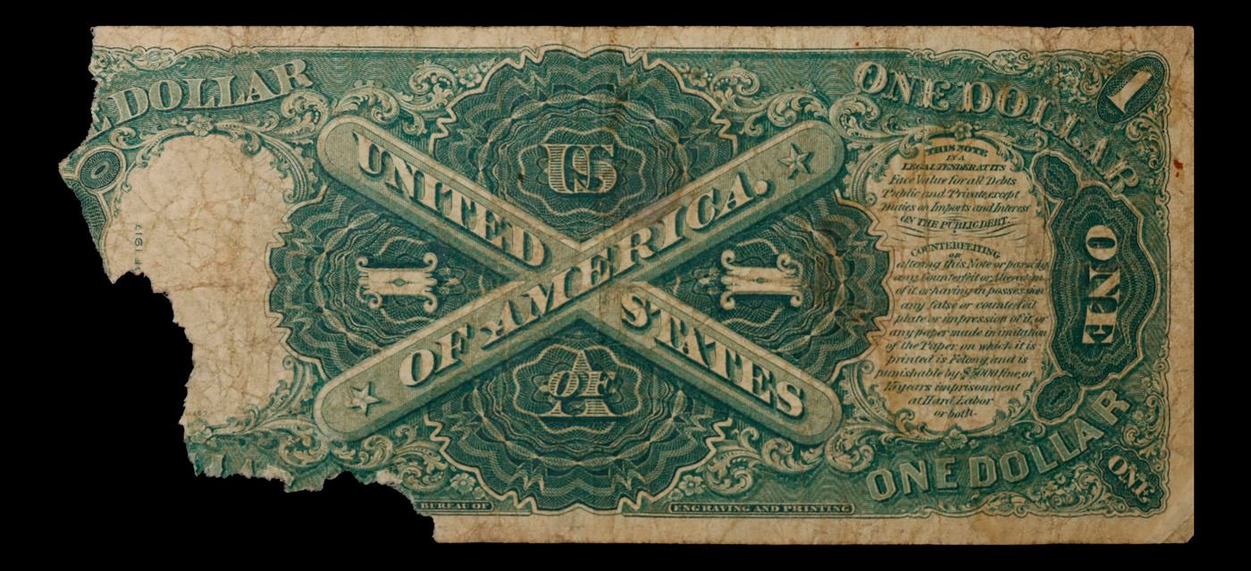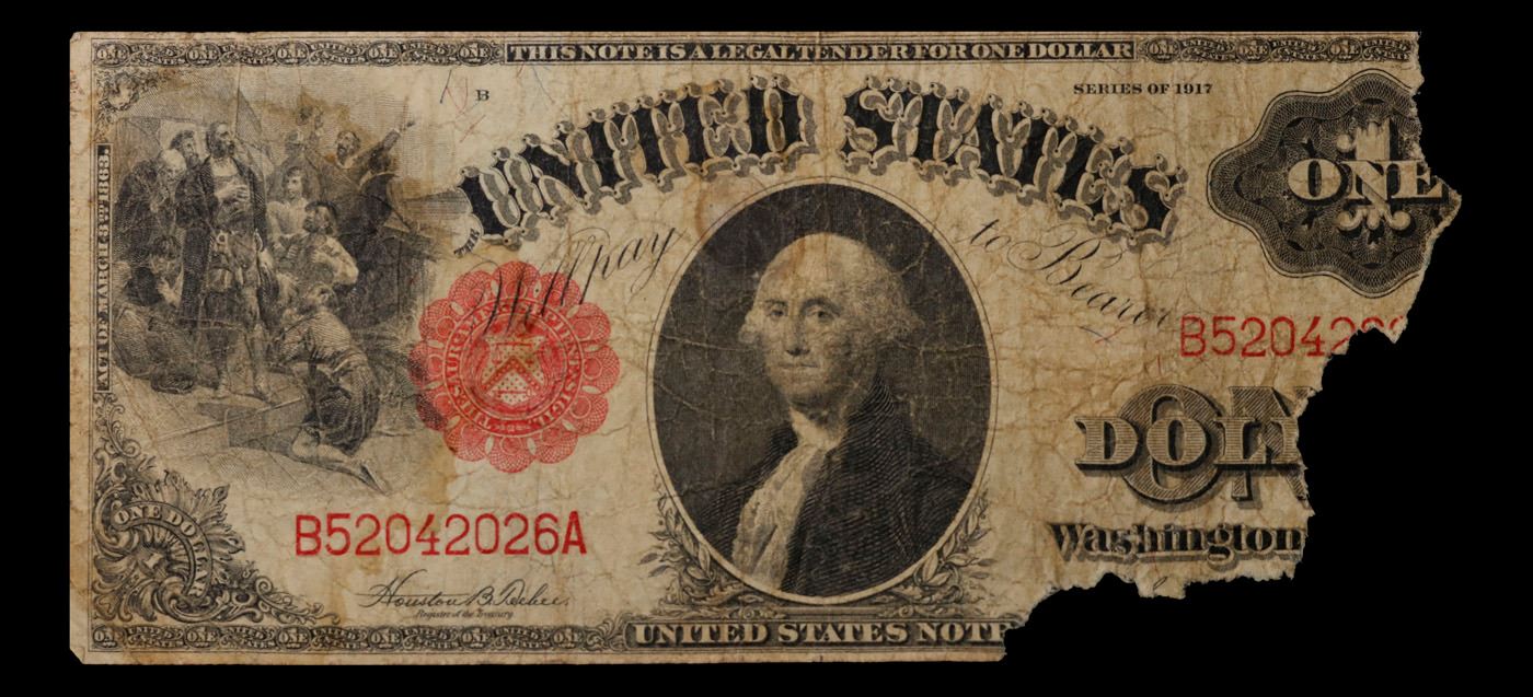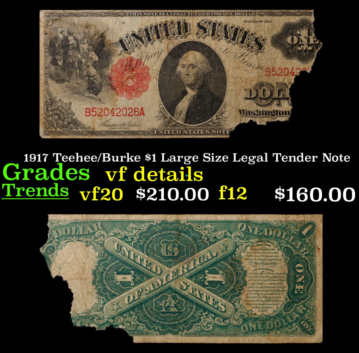 1917 $1 Large Size Legal Tender Note Grades vf details Signatures Teehee/Burke. FR-36 This 1917 $1 note is the last large-sized legal tender bank note ever issued. It's referred to as a "Horseblanket Note," due to their large size. The obverse features Washington and a vignette of Columbus sighting America. The reverse shows a "sawhorse" design. Add in the bright red seal and serial numbers and you've got a miniature work of art.