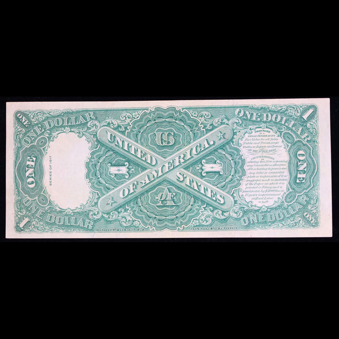 1917 $1 Large Size Legal Tender Note, Sig. of Speelman & White, FR-39 Grades Select CU. This 1917 $1 note is the last large-sized legal tender bank note ever issued. It's referred to as a "Horseblanket Note," due to their large size. The obverse features Washington and a vignette of Columbus sighting America. The reverse shows a "sawhorse" design. Add in the bright red seal and serial numbers and you've got a miniature work of art.