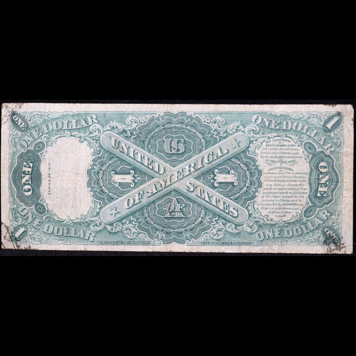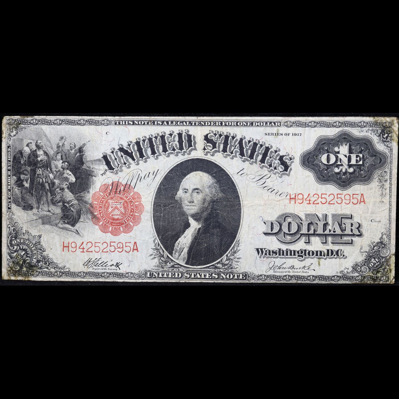 1917 $1 Large Size Legal Tender Note, Signatures of Elliott & Burke, FR-37 Grades vf++. This 1917 $1 note is the last large-sized legal tender bank note ever issued. It's referred to as a "Horseblanket Note," due to their large size. The obverse features Washington and a vignette of Columbus sighting America. The reverse shows a "sawhorse" design. Add in the bright red seal and serial numbers and you've got a miniature work of art.